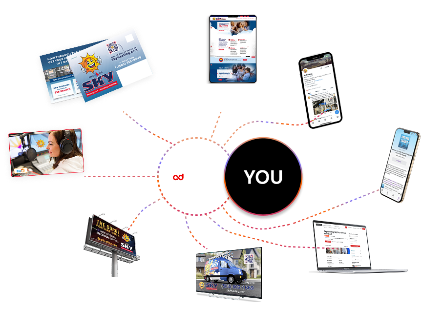 A central circle labeled "YOU" connects to various marketing channels, including email marketing, social media, direct mail, radio, podcasts, TV, out-of-home ads, partnerships, website development, and CRM.