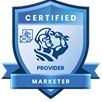 A blue badge features a helmeted figure holding a wrench, with the words "Certified Provider Marketer" in white text—symbolizing expertise in digital marketing across the shield.